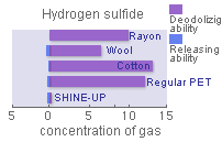 The deodorizing system of Shine-up consists of 2 stages: absorption of odorant particle into the ceramic in the fiber, followed with photo-catalytic reation leadas to decomposition of odorant molecule into CO2 and H2O by the oxidant generated by the light radiation.